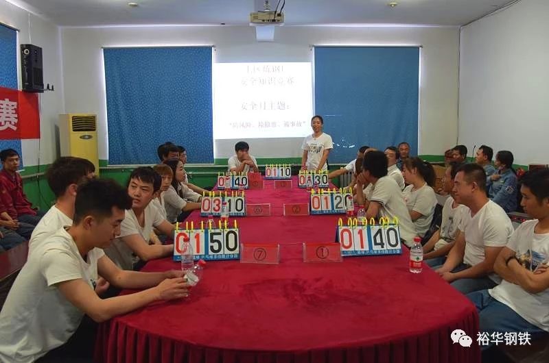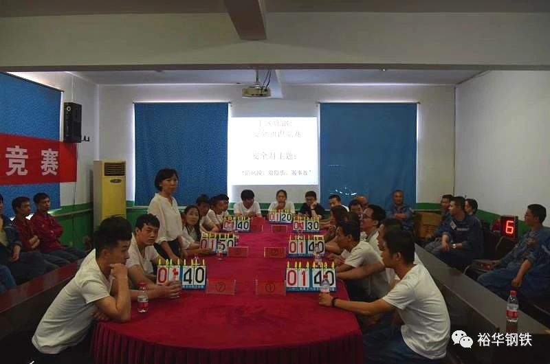 煉鋼廠電氣工段、轉爐工段、動力工段、連鑄工段、大包工段、天車工段、維修工段七支代表隊參加了本次安全知識競賽,每隊3人,競賽分為必答題、共答題、觀眾題、搶答題、風險題。