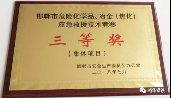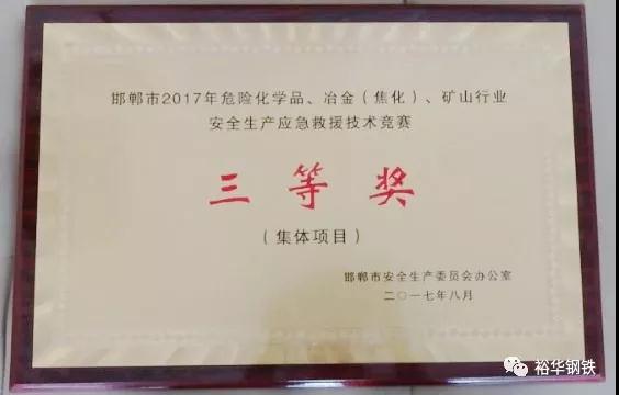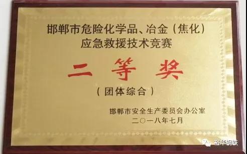 救援隊(duì)曾先后獲得2016年邯鄲市應(yīng)急比武演練團(tuán)隊(duì)第一名;2017年邯鄲市危險(xiǎn)化學(xué)品、冶金(焦化)礦山行業(yè)安全生產(chǎn)應(yīng)急救援技術(shù)競(jìng)賽集體項(xiàng)目三等獎(jiǎng);2018年邯鄲市危險(xiǎn)化學(xué)品、冶金(焦化)應(yīng)急救援技術(shù)競(jìng)賽團(tuán)隊(duì)綜合二等獎(jiǎng)、集體項(xiàng)目三等獎(jiǎng)的優(yōu)異成績(jī)。